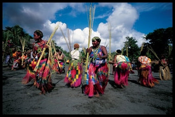 Min umiddelbare assosiasjon då me kom fram til landsbyen var ”lærarskulestudentanes jonsokfest i fjøra”. Der sat dei fint og pyntelig i ei klynge under ei lyspære som hang ned frå stråtaket å spelte og song. Sjølv om teksta var uforståeleg hadde musikken likevel eit eller anna gjenkjenneleg over seg utan at eg heilt greidde å identifisere kva. På plassen rundt kunne eg skimte ein og annan som dansa til musikken med ”tradisjonelle” bastskjørt på seg. Etter kvart som augo mine greidde å venje seg til mørkret såg eg at det var mjølkekvite leggar under fleire av bastskjørta. Ved nærare ettersyn var halvparten av alle dansande kvite turistar som skruppellaust deltok i det religiøse ritualet åt ei marginal cargo-kult i ein avsidesliggande landsby langt frå det ein kan kalle allfarveg midt i stillehavet.