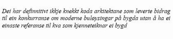 Viktigast er uansett det faktum at bygd som buform har implikasjonar for korleis framtidas Noreg vert sjåandes ut. Ønskjer me oss busette distrikt og ei jordnær befolkning lyt me hegne om bygd som buform. Då er det minste me bør kunne forvente av arkitektstanden at dei tek seg bryet med å sete seg inn i kva ei bygd er før dei reproduserar gamle skisser som ikkje nådde opp i tidlegare konkurransar, og prøver å kome opp med ein passe kul tittel og nokre kvasifaglige klisjear i prosjektomtala som harmonere slik måteleg med utlysinga.
