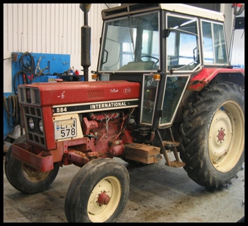 Den siste gardbrukaren som hadde International var far min. Den raude 584’en, med beksvart skaiinteriør, servostyring, våte sylinderforingar og kvite felgar var reine nytinga å sjå på. Med varmeapparat og ein kassettspelar som husa anten Kris Kristoffersen eller Inger Lise Rypdal var det reine fryda å sete attom skuldra åt far min på turar heimetter bygdene.