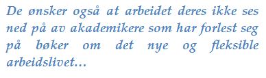 Implikasjonen av dette er ikke at vi som lever middelklasseliv, som regel med to likestilte partnere som har hver sin karriere å ta vare på, skal forkaste våre egne verdier. Men vi bør slutte å innbille oss at dette er den vanlige måten å leve det norske livet på. Målet for venstreorienterte akademikere kan ikke være at alle skal bli akademikere, men at alle skal kunne gi like mye mening til livet som dem selv. For en rengjører er det ikke nødvendigvis like fint å jobbe som å danse. Det er en kilde til livsopphold; et middel, ikke et mål i seg selv. Målet kan ikke være at alle familier skal underordne seg Arbeiderpartiets kvinnebevegelse. Arbeiderklassen drømmer hverken om professorat eller sosial klatring, men om tilværelser som ikke nedvurderes av myndigheter og livsstilsdommere, og som ikke trues av svekkede rettigheter for vanlige arbeidstakere. De ønsker også at arbeidet deres ikke ses ned på av akademikere som har forlest seg på bøker om det nye og fleksible arbeidslivet, hvor kunnskap er alt og manuelt arbeid ingenting. Skal venstresiden ha en sjanse, må den slutte å projisere sine egne drømmer og karriereorienterte ambisjoner over på arbeiderklassen.