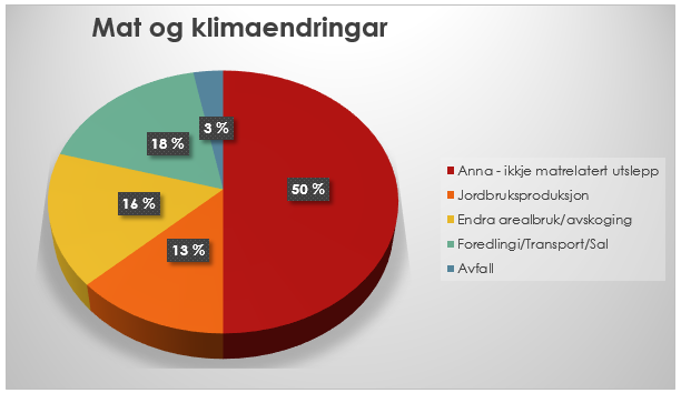 Mat er verdas største økonomiske sektor og sysselset langt fleire enn nokon annan industri. Sjølv om det er vanskeleg å finne sikre tal på det totale bidraget til klimagassutsleppet som stammar frå foredling, pakking og distribusjon av mat er det rimeleg å anta at det truleg står for mellom 15 og 20 prosent[5].