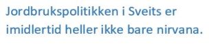Jordbrukspolitikken i Sveits er imidlertid heller ikke bare nirvana. Den er for eksempel kostbar, der Norge bruker 14,5 milliarder i budsjettstøtte, er det i Sveits budsjettert med 29 milliarder kroner. Politikken kritiseres også for at balansen mellom matproduksjon og fellesgoder er gått i disfavør av volumproduksjonen. Balansen mellom matforsyning og fellesgoder er kjernen i landbruksdebatten i begge land og vektleggingen av produksjonsavhengig støtte versus produksjonsuavhengig har ikke enkle svar. Uansett er det lite som er så svekkende for nasjonal matsikkerhet som å la grasareal gro igjen mens drøvtyggerne fôres på importerte kraftfôrråvarer.