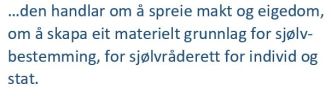 Det er ikkje noko naudsynt likskapsteikn mellom individuelt eigarskap, fridom og den demokratiske tradisjonen frå 1814 slik høgresida ofte hevdar i dag. Dersom eigarskapet ikkje også er sosialt og lokalt ankra, så er ein like langt. Dei nasjonale og globale aktørane som hopar opp eigedom i dag med heimel i privat eigedomsrett er ikkje så forskjellige frå dei eineveldige kongane frå tida kring 1814. Begge er dei langt borte frå folk flest, og begge unndreg dei seg demokratisk makt.